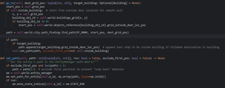 function handles pathfinding. Right now, I’m using Manhattan distance, but I may switch to HPA (Hierarchical Pathfinding A)* for shorter journeys later – more on that in another post. Once the path is calculated, it’s set on the entity manager’s arrays. The set_path_for_entity()