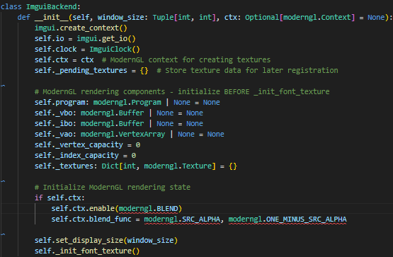 Initialization – On startup, it creates an ImGui context, sets up the IO object, and builds the font atlas into a GPU texture via ModernGL. It also prepares blend state (alpha blending) on the ModernGL context.
